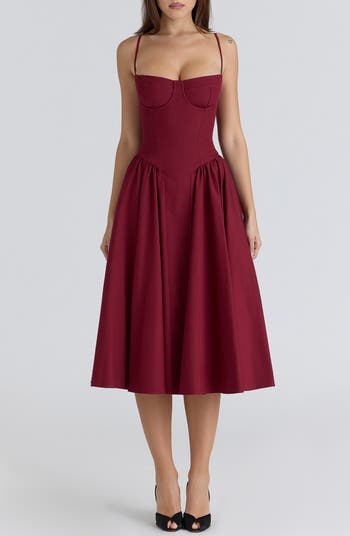 Be the topic of cocktail chatter in an intoxicating dress shaped with a signature corset bodice and painted in a wine-soaked shade. A pair of discreet pockets perfects the look.