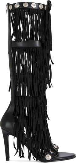 SUMAC'S big sis. Faux leather fringe stiletto sandal boot with turquoise stones down the center-bold, western-inspired, and effortlessly statement-making.Heel height: 4"Shaft height: 15"Calf circumference: 14"