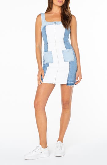 Denim patches create charm and contrast on this figure-sculpting dress cut in a leggy length and fronted with a silvery zip.