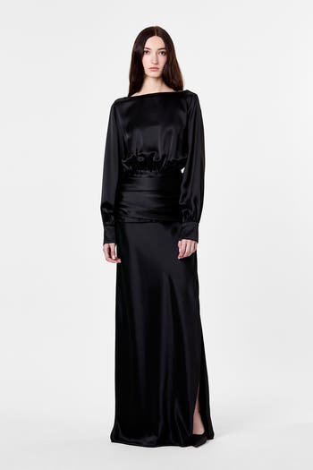 An elegant silhouette designed for celebrations, and everything in between, this long-sleeve gown is made in a luxurious satin fabric, featuring a classic boat neckline, shirred fitted waist, side zip closure and open back with soft tie detail.
