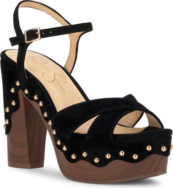 Polished dome studs trim the scalloped midsole on a retro-cool leather sandal lofted by a woodgrain platform and block heel.