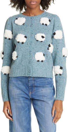 A flock of fluffy sheep graze across the wooly landscape of this darling cardi that will get asked about.