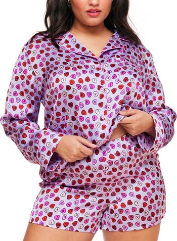 Curl up in this witchy PJ Set! This satin set features a long sleeve button-down top with contrast piping and a matching short with an elasticated waistband.