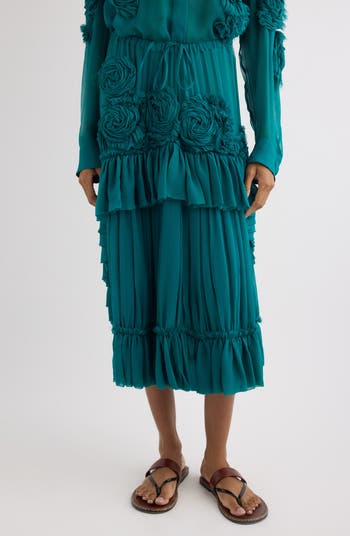 Diaphanous ruffles and flower appliqués created from creatively twisted fabric beautifully illustrate and animate this midi skirt from the spring '26 collection.