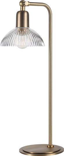 Add a touch of classic charm to your space with this dimmable, swivel-domed table lamp made with antiqued metal and a ribbed-glass shade.
