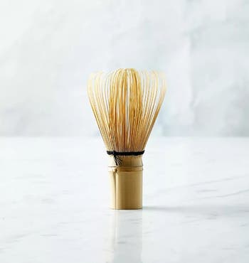 An elegantly symmetrical matcha whisk inspired by the Chanoyu tea ceremony. Handcrafted from a single, unbroken segment of lightweight natural material and bound with a simple cotton string, this Bai Chasen whips matcha into a smooth, frothy cup while reflecting refined Japanese aesthetics.