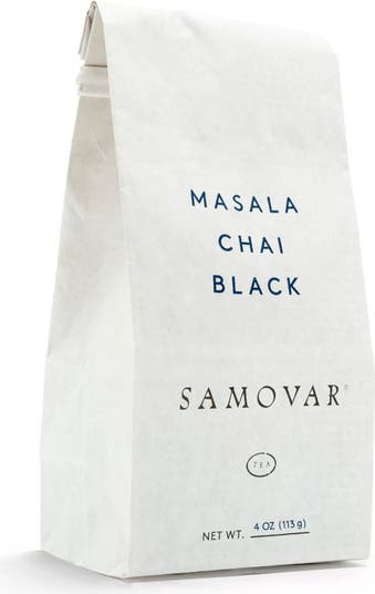 Samovar Organic Masala Chai is a hand-blended spiced black tea made in small batches from 100% organic ingredients: wild-crafted Yunnan black tea, cinnamon, cardamom pods, whole cloves, cracked black pepper and shredded ginger. Whole spices are cured for at least two months to develop deep, layered flavor.