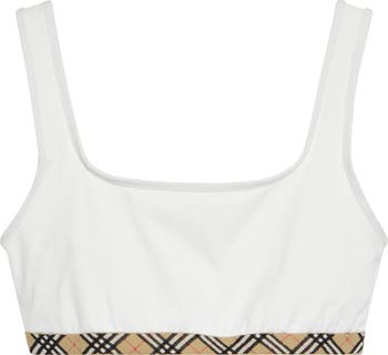This sporty square-neck bikini top cut from nylon stretch jersey in chalky white is finished with bias-cut house-check taping in the signature sandy beige coloration.