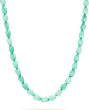 This chunky necklace is lined with cool dyed jade cut into teardrop beads to bring a dimensional, color-drenched statement to your ensembles.