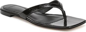 A crinkled finish and angular square toe add depth and dimension to a minimalist leather flip-flop set on a cushioned footbed and flexible rubber sole.