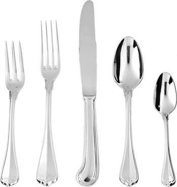Ornately sculpted edges give a vintage appearance to a brightly polished flatware set crafted of stainless steel that offers a balanced hand feel.