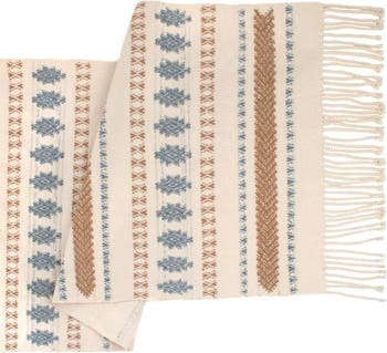 With fine brocade detail in traditional Maya motifs, the stunning San Rafael Table Runner in Natural Cotton will bring a sense of simple sophistication to any table. Expertly handwoven on a traditional backstrap loom by Maya women artisans in San Rafael in Guatemala, this unique runner is finished with hand-twisted fringe. Recycled blue denim and upcycled brown khaki threads are intricately woven to create a pattern of stars and arrows on a natural cotton background. Perfect as a wedding gift or an elevated accent for a fall tablescape.100% cotton.