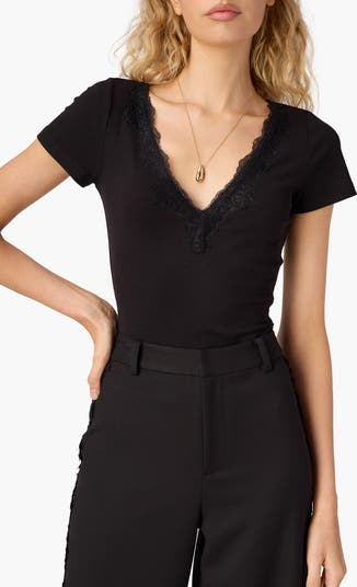 Stretch-enhanced lace trims the neckline of this supersoft ribbed T-shirt that's naturally breathable and always comfortable.