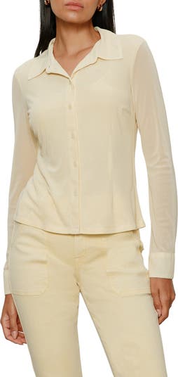 Sheer sleeves and a mesh fabrication add night-out potential to this button-up shirt.
