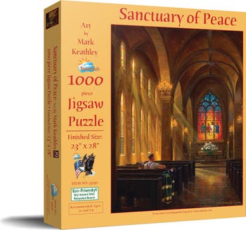 Immerse yourself in the serene journey that is the Sanctuary of Peace 1000 Piece Jigsaw Puzzle by SunsOut Inc. The enthralling artwork created by Mark Keathley offers you a tranquil escape, providing hours of relaxation and mindful meditation within the 23" x 28" finished puzzle. Each piece has been intricately designed and made with precision, using durable and eco-friendly materials like high-quality recycled cardboard and sustainable soy-based ink. This American-made puzzle not only respects top manufacturing standards but also the environment. The vibrant, licensed artwork of Mark Keathley captures the essence of tranquility, and once completed, this puzzle serves as a masterpiece suitable for display, adding elegance to any room. By choosing this puzzle, you're endorsing a small, woman-owned business that's committed to sustainability. Giving this puzzle as a gift communicates thoughts of peace and mindfulness, making it an ideal present for any occasion. Dive into the rewarding act of puzzle-solving and encounter a sense of calm with the Sanctuary of Peace 1000 Piece Jigsaw Puzzle.