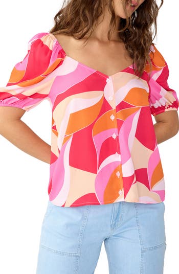 A vibrant print lends retro-inspired charm to this sweetheart-neck blouse framed by puff sleeves.