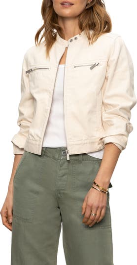 A cotton fabrication and a creamy neutral hue soften the edge of a moto jacket fixed with signature silvery zip details.