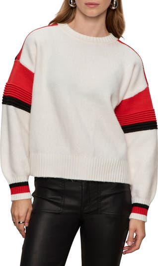 Graphic blocks of contrast bring a dynamic jolt to this crewneck sweater, while roomy dropped shoulders relax the line for a sport-leaning silhouette that feels easy yet looks striking.