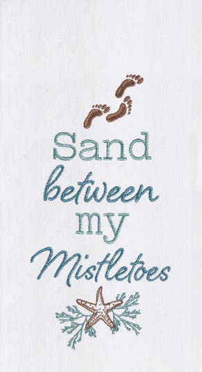 Enjoy the sand-sational fun of the Sand Between My Mistletoes Flour Sack Kitchen Towel. This fabulously fun cotton towel is perfect for adding coastal Christmas cheer to any kitchen. Whether fishing for coastal shells or walking your sandy footprint to the beach, it's the ideal piece for keeping the holiday season merry and bright!