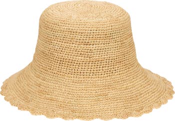 Head for a day in the sun in this shade-providing hat crocheted from raffia straw and charmed with a scalloped brim.