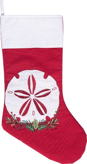 Bring coastal charm to your holiday celebrations with the Sand Dollar Stocking. The vibrant colors and detailed applique and embroidery design makes it a standout piece for your festive celebrations. This stocking, featuring a delicate sand dollar design on a festive red background, adds a touch of seaside elegance to Christmas decor.