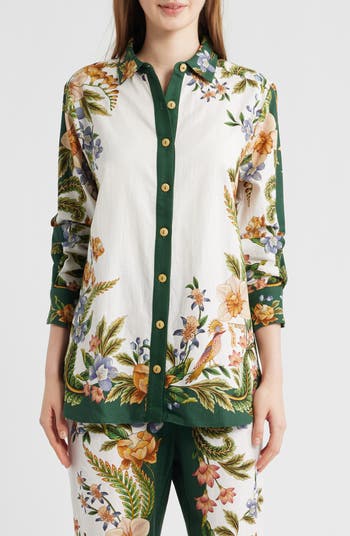 A serene floral-and-fauna print sets the stage for casual comfort in this button-up cut in a relaxed fit from a viscose-softened linen blend.