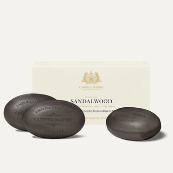 A Triple-Milled Plant Based Soap for Bath & Shower, Oval with Logo. Aromatic Australian sandalwood blended with a secret recipe of green botanicals. Smoky cypriol and a whisper of powdery musk add a subtle seductive nuance at the base.