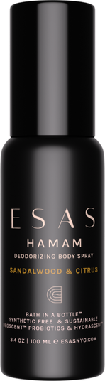 - HOW IT WORKS : Inspired by the ancient Hamam ritual, Esas Hamam Deodorizing Body Spray is your "bath in a bottle," designed to purify, cleanse, and refresh. Rooted in a tradition that dates back to the 14th century, this unique body spray brings the essence of Roman baths into the modern day. Scientifically formulated with the purest ingredients, including Certified Organic Botanical Alcohol*, Witch Hazel, Coconut-Derived Glycerin*, and Esas DeoScent™ Sugarcane Ferment*, it effectively cleanses, deodorizes, and refreshes your skin wherever you go. Enriched with hydrating hyaluronic acid, vitamin E, and antioxidant-rich grape leaf tincture, this spray not only purifies but also nourishes, leaving your skin feeling revitalized and lightly scented. Perfect for an on-the-go refresh, it's the ultimate solution for staying clean, refreshed, and fragrant throughout your day.