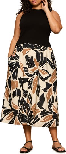 A smooth knit bodice gives way to full skirt in a vacation-ready dress perfected with a pair of handy pockets.