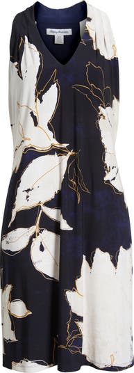 Golden lines highlight the petals all around a breezy shift in wrinkle-resistant fabric that's perfect for traveling.