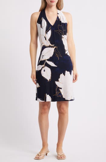 Golden lines highlight the petals all around a breezy shift in wrinkle-resistant fabric that's perfect for traveling.