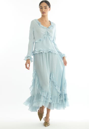 Secret Mission’s Sander Blouse is crafted from 100% organic silk crepe georgette, offering a soft, airy texture with elegant drape. Designed with a ruffled neckline, gathered front detail, and flounced cuffs and hem, this blouse brings romantic femininity to any look. The lightweight fabric enhances movement and flow, making it perfect for both day and evening styling.