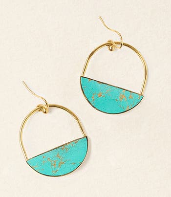 Our energetic Sandhya Collection combines reconstituted stone charms and handcrafted brass on gold tone elements in eye-catching, boho chic designs. Traditional jewelry making techniques of Old Delhi are thoughtfully applied in this modern design. These handcrafted drop earrings feature a unique linked design with bezeled, reconstituted semiprecious stone slice charms and shiny, brass gold finish accent charms.