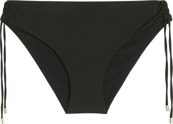 Golden-tipped drawstrings dangle at the sides of these ruched bikini bottoms that provide moderate coverage in back.