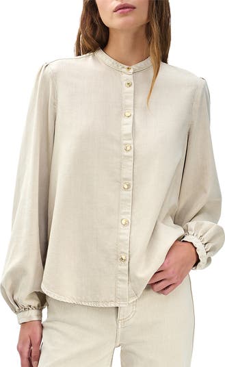 Golden buttons bring high-shine polish to this shirt framed by lightly billowed sleeves and a curved shirttail hem.