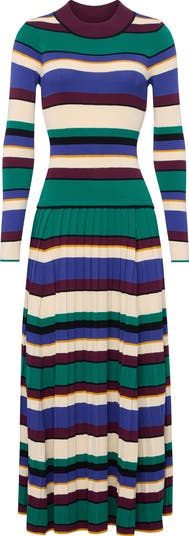 Maxi-length long sleeve knit dress featuring multicolor tropical stripes. Designed with a fitted bodice and pleated skirt for a flattering drape below the waist.