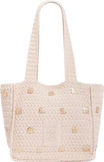 Crochet mesh bag embellished with embroidered metal tassels and a magnetic fastening.