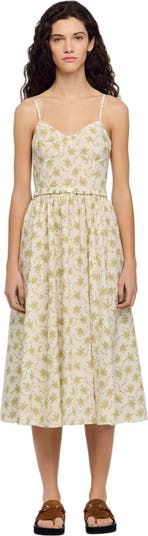 Long dress with straps, featuring a floral print, corset-effect top and flared skirt.