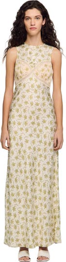 Sleeveless floral print maxi dress featuring a round neckline with lace trim, a side zip fastening and a slightly flared skirt.