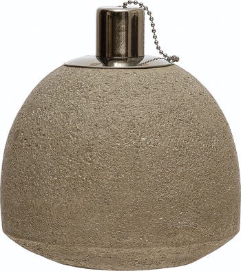 - This rustically modern oil lamp features organic cement construction adorned with a striking metal accent