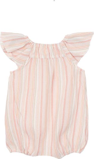 This delightful baby girl's romper features a soft striped pattern in shades of pink, peach, and white. It is designed with flutter sleeves and a gently smocked neckline for added style and comfort. Fabric Care & Content Machine Wash Cold | Line Dry | Do Not Bleach 50% Cotton 50% Polyester