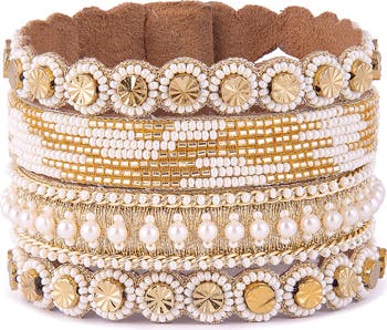 Add some bohemian bling to casual ensembles with this suede-backed cuff bracelet decorated with glowing faux pearls and polished beads.
