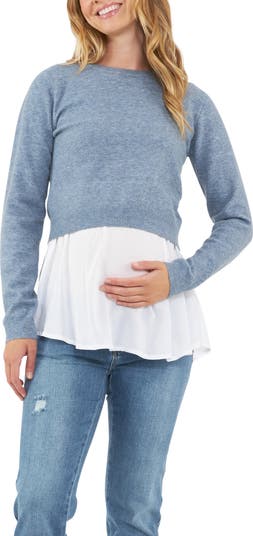 - Semi fitted Fully fashion knit with jersey/woven underlayer Round neckline Long sleeve The underlayer is detachable and can be worn under other garments. The sweater can be worn on its own Nursing 50% Acrylic, 40% Nylon, 5% Wool, 5% Elastane Length: 47cm size small knit, 76cm underlayer (size small)