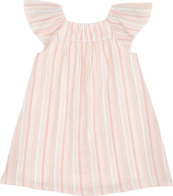 This charming girl's dress features a delicate striped pattern in soft shades of pink, peach, and white. Designed with flutter sleeves and a smocked neckline, it offers a comfortable and stylish fit. Fabric Care & Content Machine Wash Cold | Line Dry | Do Not Bleach 50% Cotton 50% Polyester
