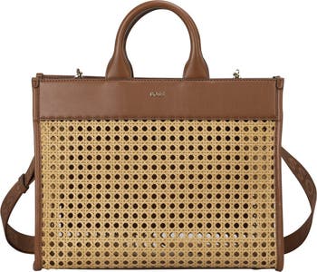 Gleaming logo hardware details a mixed-media tote that's designed with wicker-weave side panels and framed with faux-leather trim. Top carry handles and a removable strap offer plenty of styling options.