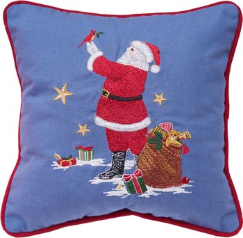Add a festive feel to your holiday decor with this 10 x 10 Santa and Cardinal Pillow. Boasting an embroidered Santa holding a cardinal in his hands, this pillow on a blue background is sure to bring a flutter of cheer to your home. Perfect for snuggling up with a cup of hot cocoa while admiring this charming winter scene.