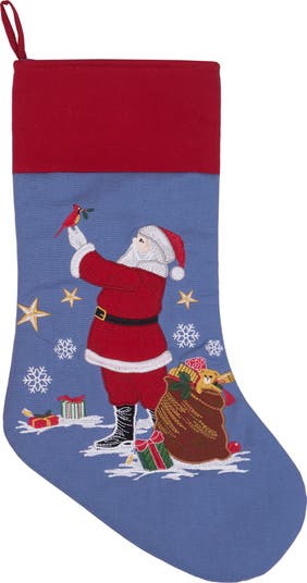 - Featuring a beautifully embroidered Santa Claus holding a red cardinal on a blue base with a classic red cuff, this stocking captures the essence of Christmas cheer. The intricate stitching and vivid colors create a timeless decorative piece for your home.