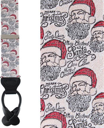 Celebrate the season in style with the Santa Claus is Watching Braces, a festive accessory crafted from the finest silk. Playfully sophisticated, this design features a repeating motif of the jolly old gentleman himself, complete with his iconic red cap, and framed by elegant hand-lettered holiday greetings. The rich contrast of the deep black, classic red, and snowy ivory created a timeless holiday aesthetic with a whimsical twist. Finished with genuine leather button ends and polished nickel hardware, these braces deliver impeccable craftmanship and enduring quality. Whether worn to an elegant Christmas gathering, a holiday gala, or to spread festive cheer, they offer a perfect balance of seasonal fun and sartorial refinement. Braces are adjustable from 33 to 48 inches long and are 35mm or 1 3/8 inches wide.