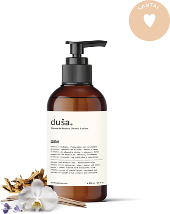 Immerse your hands in the luxurious warmth of Santal. This hand cream features rich aromatic notes of cardamom, saffron, orris, sandalwood, vetiver, and musk for a truly sophisticated experience. Formulated with natural fruit extracts, shea, mango, and cocoa butter, plus nourishing almond and sunflower oils, it deeply hydrates, soothes, and protects, leaving your hands velvety-soft and beautifully scented. TASTING NOTES: sandalwood, cardamom, saffron, orris, vetiver, and musk. About this product WHY YOU'LL LOVE IT: You’ll love it for its warm, sophisticated fragrance and deeply nourishing ingredients that soften, condition, and protect, making your hands feel pampered and smooth with every use. TOXIC FREE: Free from harmful phthalates, parabens, carcinogens LUXURY SCENTS: We only use premium ingredientes and sophisticated scents in our formulations. INGREDIENTS :Aqua, Glycerin, Tapiocha Starch, PEG-100 Stearate, Cetyl Alcohol, Parfum, Glyceryl Stearate,Polyacrylate-13, Helianthus Annuus (Sunflower) Seed Oil, Magnesium Sulfate, IsopropylPalmitate, Butyrospermum Parkii (Shea) Butter, Aloe Barbadensis Leaf Juice, SimmondsiaChinensis (Jojoba) Seed Oil, Prunus Amygdalus Dulcis (Sweet Almond) Oil, Persea Gratissima(Avocado) Oil, Theobroma Cacao (Cocoa) Seed Butter, Mangifera Indica (Mango) Seed Butter,Phenoxyethanol, Ethylhexylglycerin, Tocopherol, Polyisobutene, Polymethylsilsesquioxane, Polysorbate 20, Sodium Hydroxide.