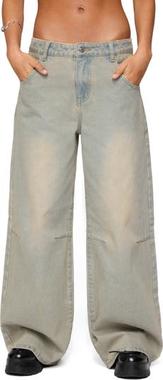 Relaxed and baggy wide legs give laid-back shape to these ultrafaded-blue jeans cut with a trendy low rise from nonstretch denim for an authentic feel.